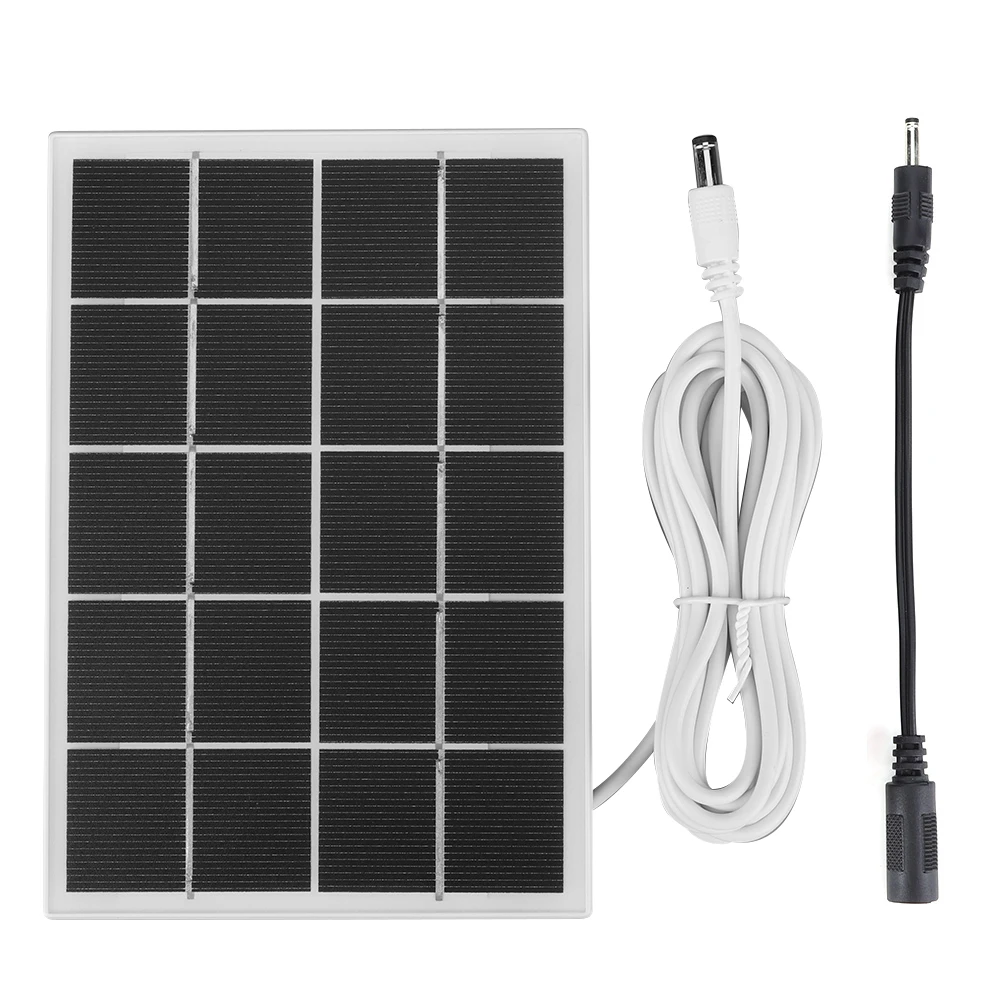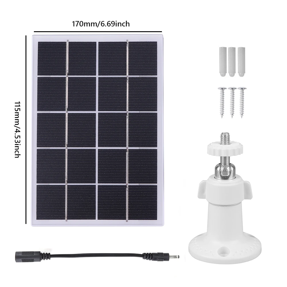 Feature: 1. Customized Design for Enhanced Compatibility: Our solar panel charger is uniquely designed to fit compatible with Ring Stick Up Cam and Ring Spotlight Cam Battery Version seamlessly. It comes with a DC5.5*2.1mm charging cable and includes a DC 3.5*1.35mm adapter, making it more versatile than other solar panels. This feature allows it to be compatible with other rechargeable cameras that support DC5.5*2.1 & DC3.5*1.35 interfaces, ensuring broad applicability. 2. High-Efficiency Charging with Premium Silicon: The solar panel utilizes A-grade monocrystalline silicon cells to achieve high power output and conversion efficiency. This means more power and faster charging speeds under the same sunlight conditions, providing continuous, uninterrupted solar power to your camera in well-lit environments. 3. Built-In Voltage Regulator for Safe Charging: Equipped with an intelligent IC, our camera solar panel charger offers protection against overcharging, overheating, overvoltage, and short circuits, ensuring safe and continuous charging. The stable output voltage maintains within a set range regardless of input fluctuations, protecting your camera from potential voltage damage. 4. and Weather-Resistant Design: Designed to withstand the elements, the camera solar panel features a weather-resistant grade with an ABS+PC shell and a corrosion-resistant mounting bracket for extended durability. The PET laminated surface effectively prevents environmental damage, making it resistant to UV rays, rain, and wind. It can operate reliably in various climatic conditions, providing your camera with a steady supply of solar power. 5. Adjustable Mount & Easy Installation: Our solar panel kit includes a wall-mount bracket and a lengthy 9.8 feet (3 meters) charging cable, allowing for easy installation in optimal sunlight locations across different seasons. Simply drill holes, install the 360° adjustable bracket, position the solar panel towards direct sunlight, and connect the charging cable to your camera. Note: Please ensure waterproofing measures are taken at the cable interface for outdoor installation. Specification: Origin: Mainland China Certification: CE Type: Solar Panel Number of Panels: 1 Name: Solar charging panel Material: Monocrystalline silicon Process: PET lamination Color: White, black (optional) Power: 4W Working current: 0-700MA Short circuit current: 750MA Working voltage: 5V (charge 3V-5V battery) Short circuit voltage: 6.2V Charging interface: DC5.5*2.1 charging cable + DC3.5*1.35 conversion cable Working conditions: 32°F-122°C (0°C to 50°C) Charging cable length: 3M Dimensions: 170*115*10MM/6.69x4.53x0.39inch Weight: about 150G Applicable models: (It is not suitable for the "plug-in" version and the "wired" version, and can only power the rechargeable battery version of the camera.) Compatible with Ring Stick Up Cam Battery Version Compatible with Ring Spotlight Cam Battery Version And other models that support DC5.5*2.1& DC3.5*1.35 interface rechargeable battery powered camera Warm Tips: a. Please read our description carefully and confirm your device model and corresponding charging interface before placing an order. b. Regular cleaning of solar panels can extend the service life of solar panels. c. In winter, the lack of sunlight may reduce the charging efficiency of solar panels. You can use household electricity to charge your device when necessary. d. Please install the solar panel in a sunny place and tilt the solar panel slightly to avoid leaves, water or dust on its surface.