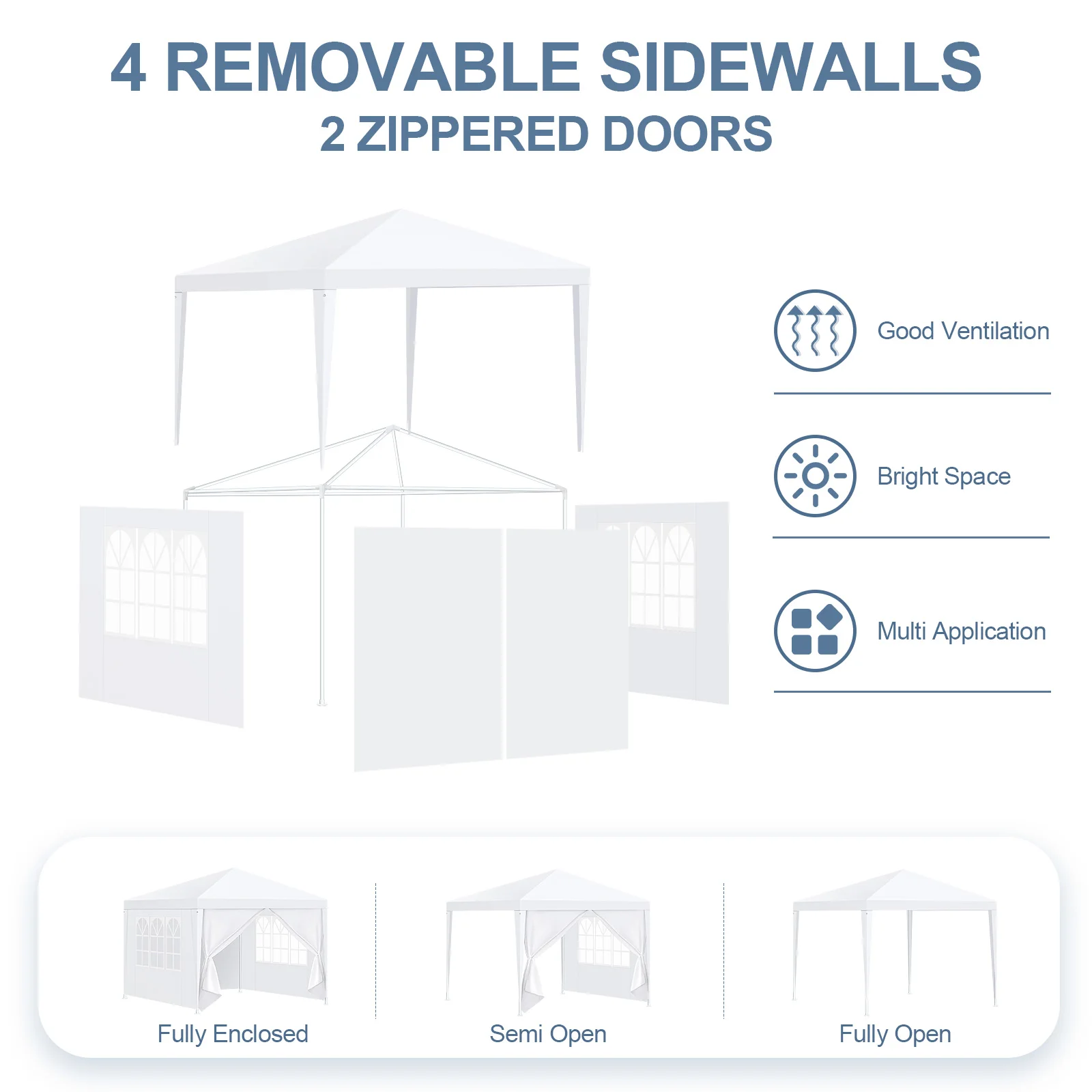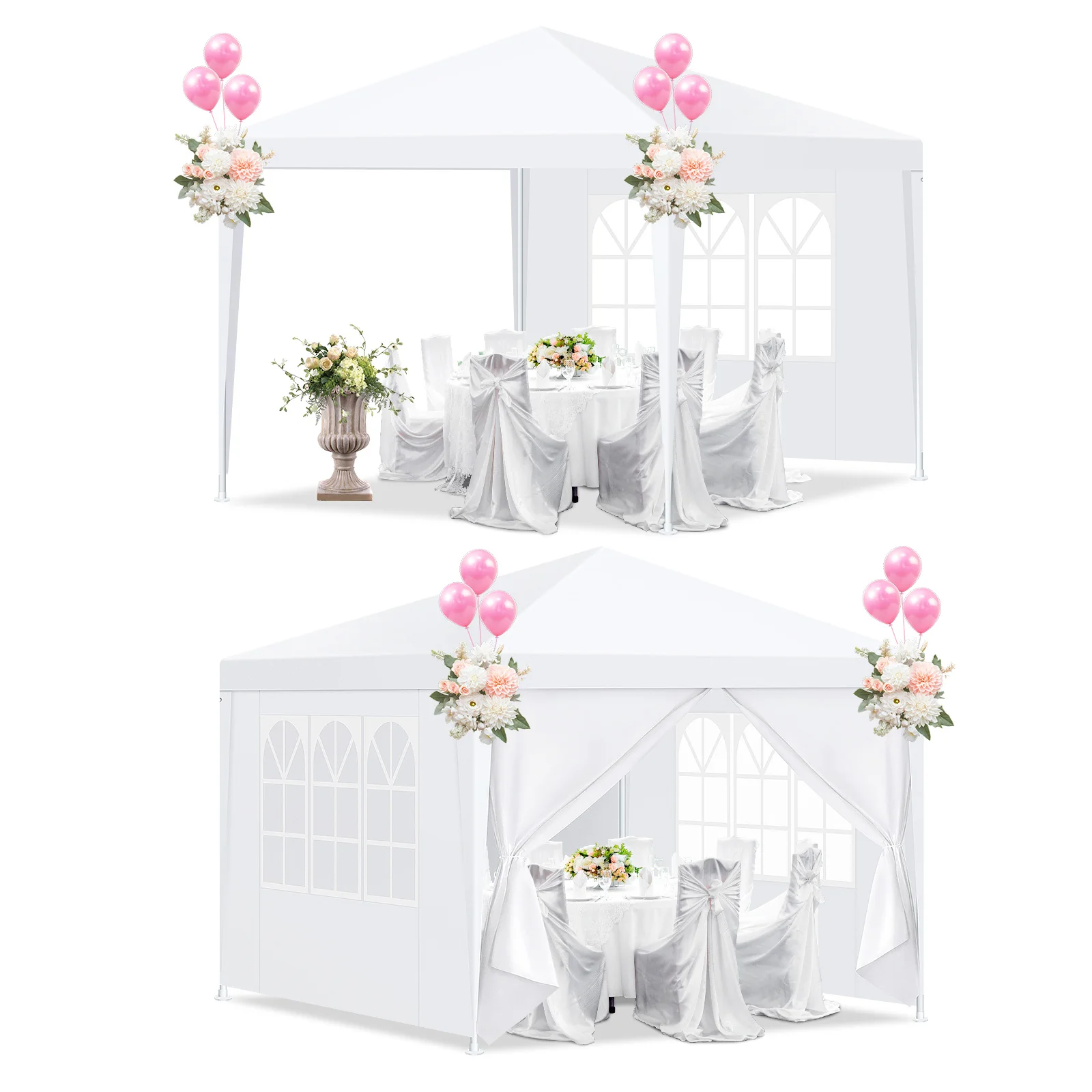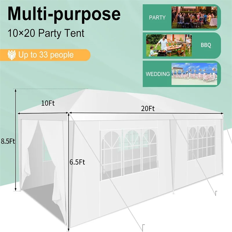 ✅【Spacious】Dimensions: 10x10 ft (3x3m), featuring 2 removable sidewalls and 2 zippered doors. Our 10x10 party tent comfortably fits up to 20 people and a round table