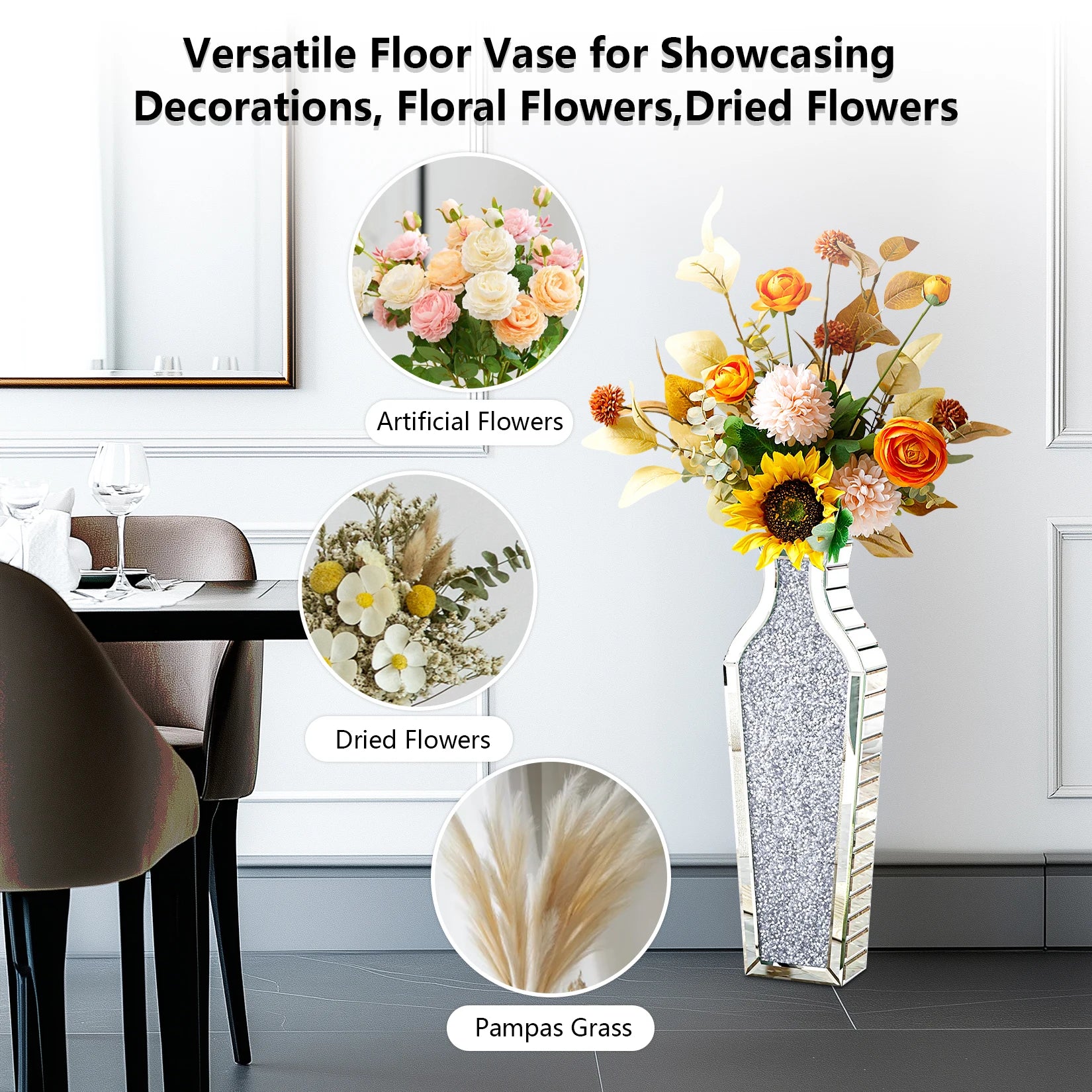 27" Tall Crushed Diamond Floor Vase, Silver Large Vases for Decor Living Room Crystal Mirrored Home Decor Vases for Dried Flower
