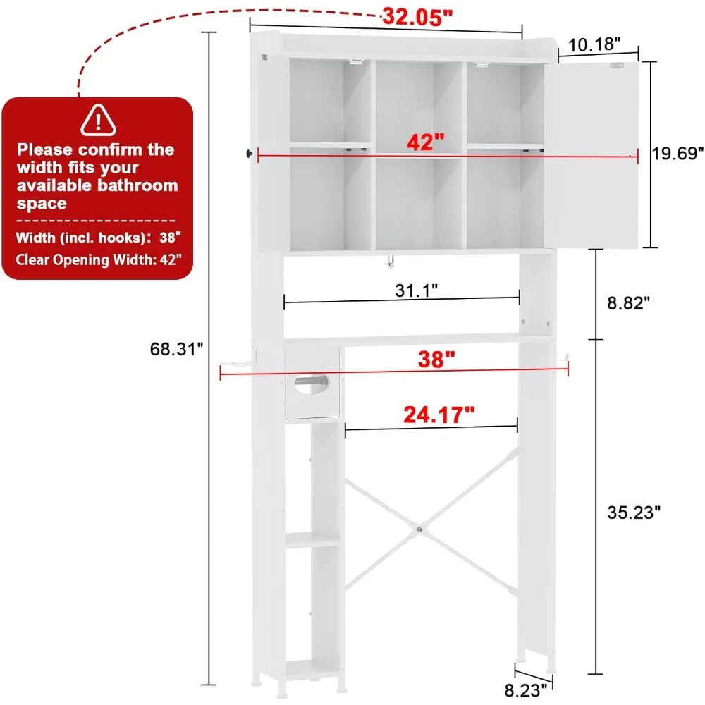 - 【Versatile Usage Scenarios】With overall dimensions of 7.7"D x 32.0"W x 68.3"H, this bathroom storage cabinet over toilet fits most standard-height toilets and select compact washing machines. You can place it in the bathroom, laundry room, or balcony according to your preference. The middle shelf is positioned at a height of 35.4 inches. Please verify that these dimensions meet your space requirements before purchasing.