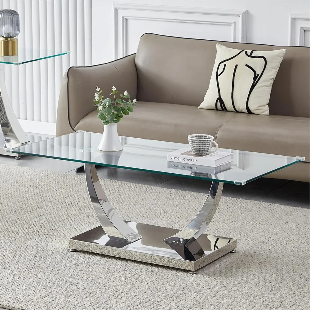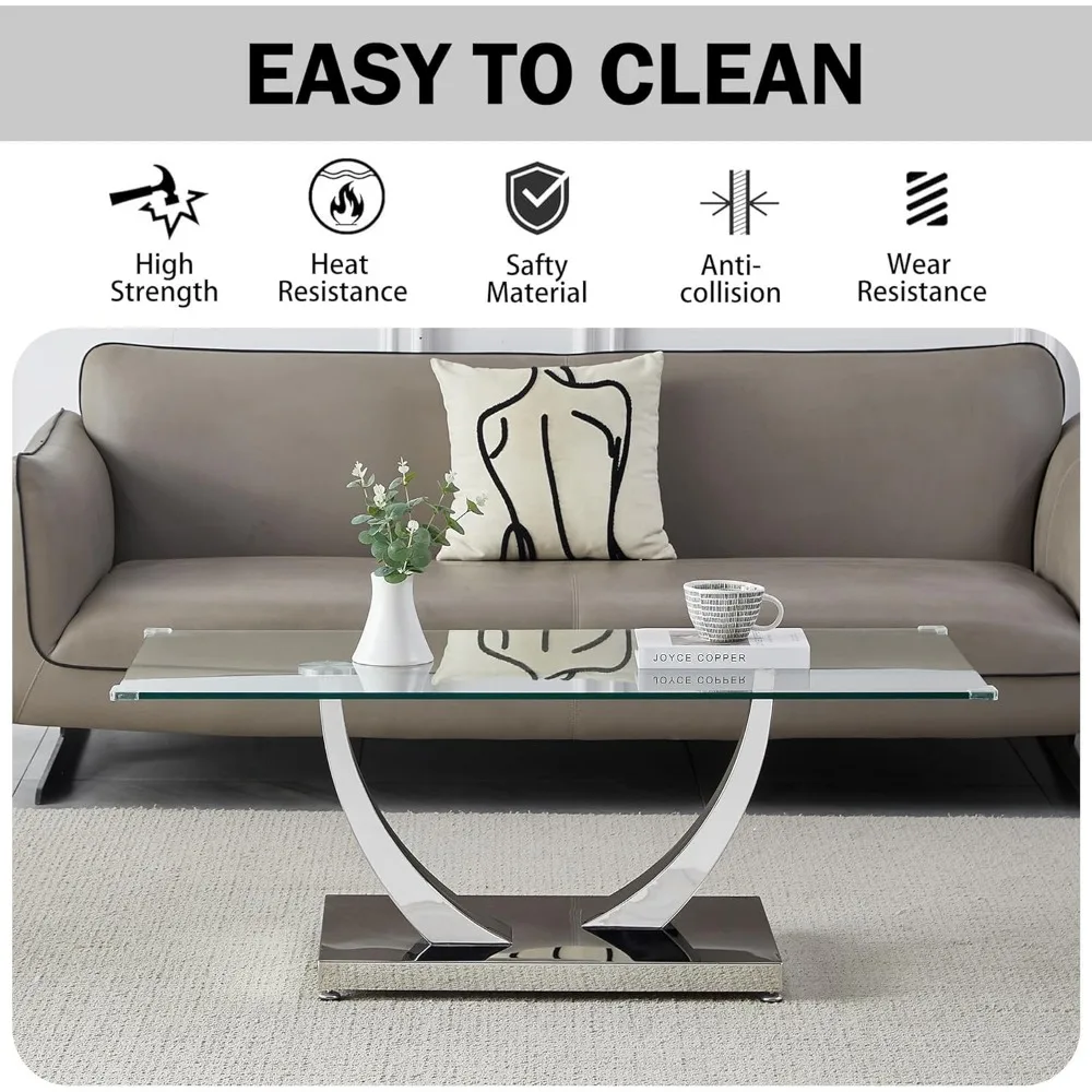 - Unique Design: This coffee table features a transparent glass top paired with a shiny golden silver U-shaped stainless steel base, showcasing elegance and luxury that elevate your home décor.