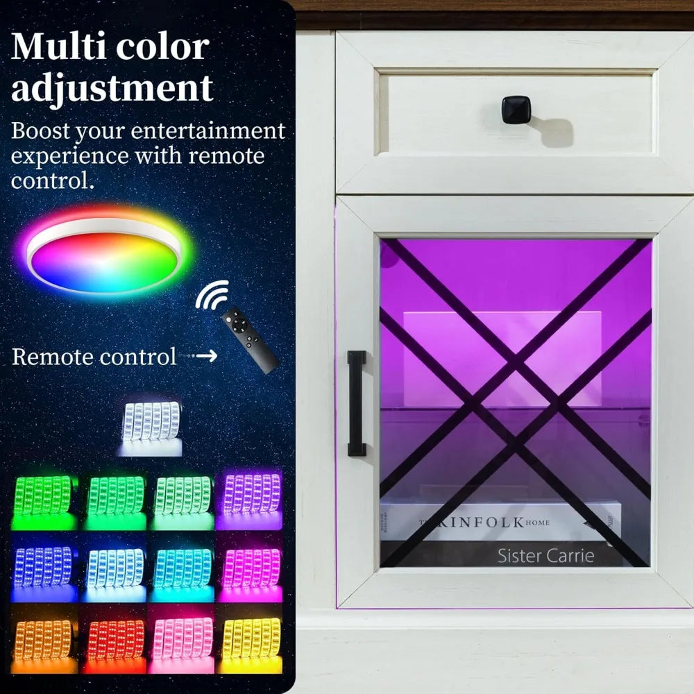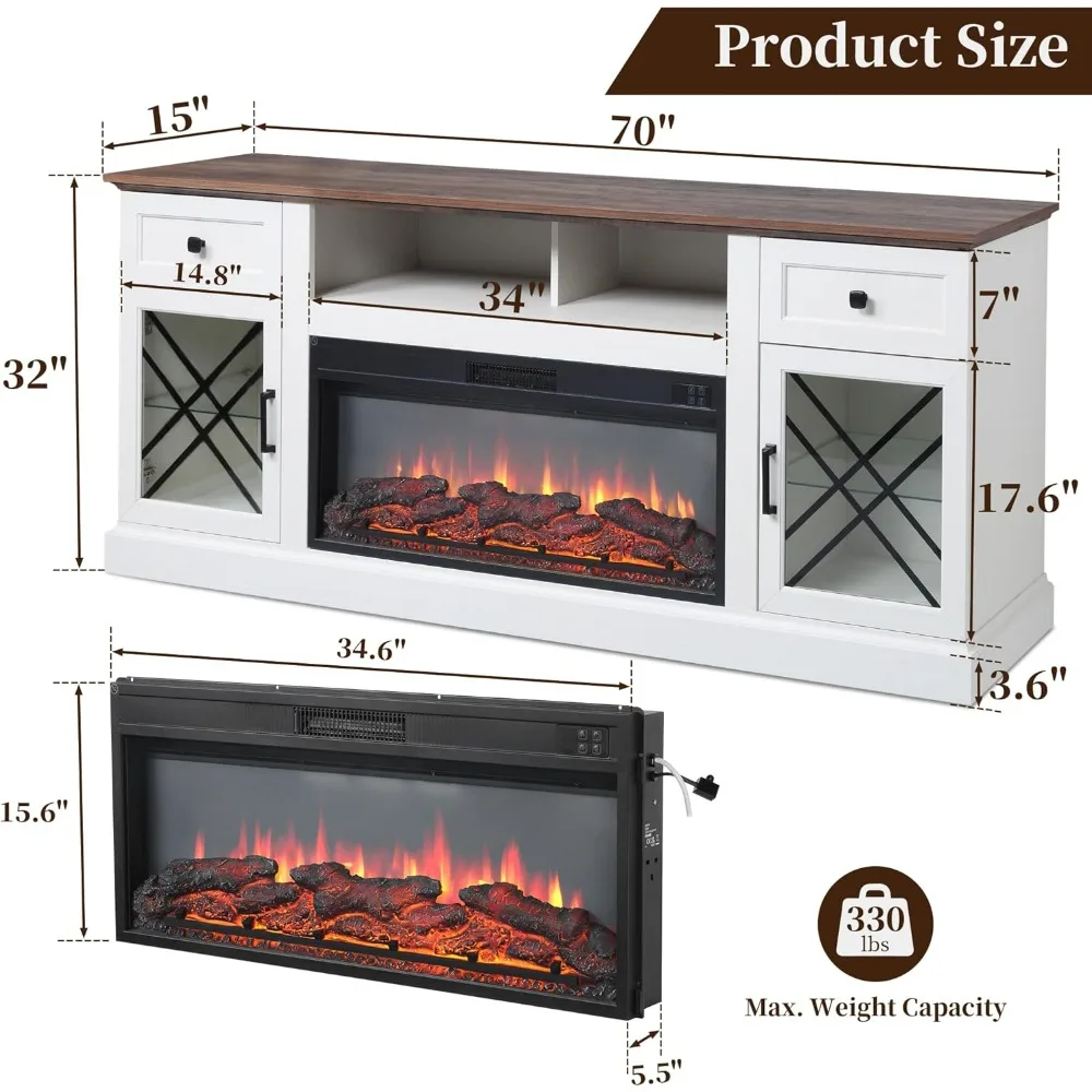 - Multifunctional TV Stand with Electric Fireplace: The built-in 34-inch electric fireplace brings both warmth and style to your home. Offering 12 LED color options and delivering 5000 BTUs per hour, it efficiently heats up to 400 sq. ft., creating a cozy and welcoming atmosphere--one that’s for relaxing evenings spent together.