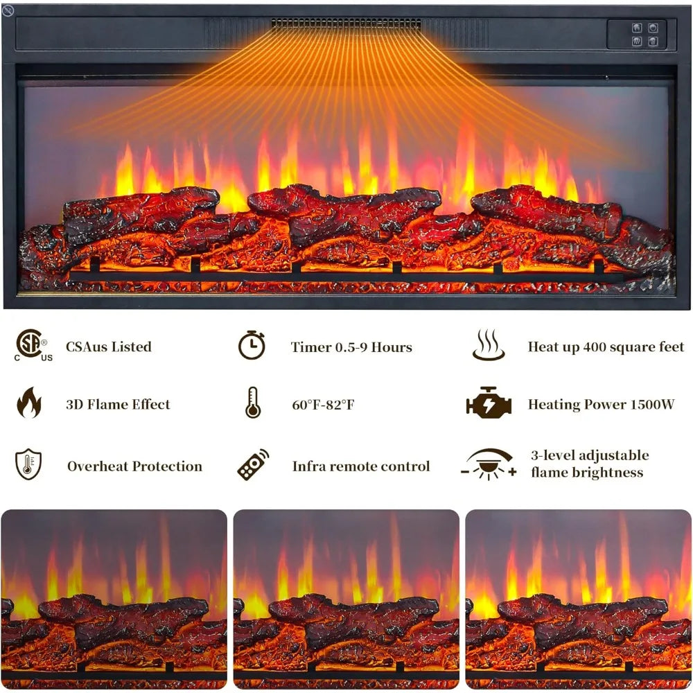- Fireplace Specifications: CSAus Certified for Safety, Realistic 3D Flame Effect with 3 Brightness Levels, Adjustable Temperature Range: 60 - 82°F, Timer Function: 0.5 - 9 Hours, and Overheat Protection for Added Safety. Offering 12 LED color options and delivering 5000 BTUs per hour, it efficiently heats up to 400 sq. ft., creating a cozy and welcoming atmosphere—perfect for relaxing evenings together.