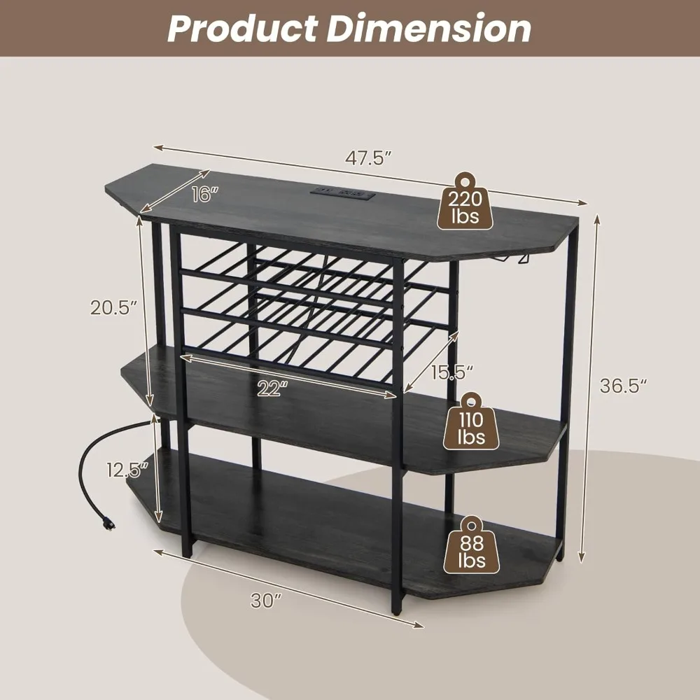 Bar Table Cabinet with Power Outlet & USB Port, 21 Bottle Wine Rack & Glass Holder, 3 Tier Mini Coffee Bar Stand for Liquor, In