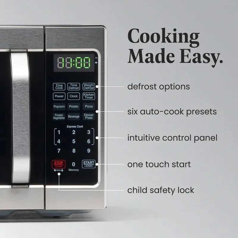 Say goodbye to guesswork with six (6) one-touch cooking options from our kitchen countertop oven, including settings for popcorn, potato, and pizza. Simply press a button, and our microwave will automatically adjust the power and cook time for optimal results.