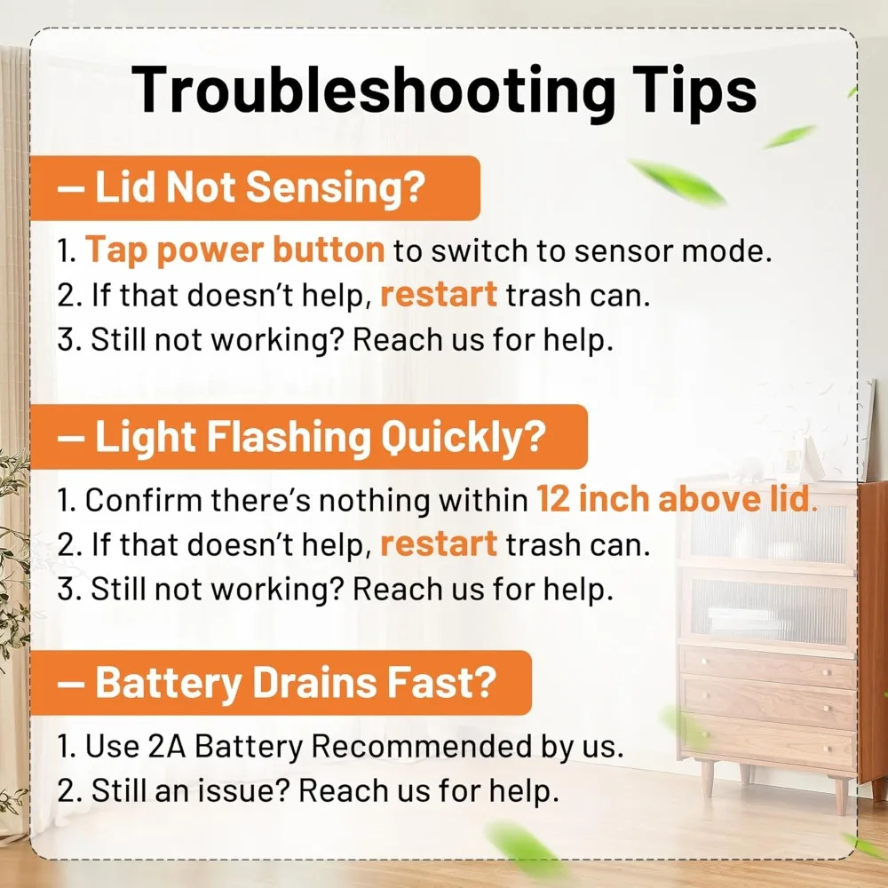 - ★★★ 𝗔𝗳𝘁𝗲𝗿 𝘁𝗵𝗲 𝗔𝗔 𝗯𝗮𝘁𝘁𝗲𝗿𝘆 𝗶𝘀 𝗶𝗻𝘀𝘁𝗮𝗹𝗹𝗲𝗱, 𝘁𝗵𝗲 𝘁𝗿𝗮𝘀𝗵 𝗰𝗮𝗻 𝗶𝘀 𝘁𝘂𝗿𝗻𝗲𝗱 𝗼𝗳𝗳. 𝗣𝗥𝗘𝗦𝗦 𝗔𝗡𝗗 𝗛𝗢𝗟𝗗 𝗧𝗛𝗘 𝟭.𝟱𝗦 𝗣𝗢𝗪𝗘𝗥 𝗕𝗨𝗧𝗧𝗢𝗡 𝗧𝗢 𝗧𝗨𝗥𝗡 𝗢𝗡 𝗧𝗛𝗘 𝗧𝗥𝗔𝗦𝗛 𝗖𝗔𝗡. 𝗜𝗳 𝘁𝗵𝗲 𝗶𝗻𝗱𝗶𝗰𝗮𝘁𝗼𝗿 𝗹𝗶𝗴𝗵𝘁 𝗳𝗹𝗮𝘀𝗵𝗲𝘀 𝗿𝗲𝗱, 𝘁𝗵𝗲 𝗯𝗮𝘁𝘁𝗲𝗿𝘆 𝗶𝘀 𝗹𝗼𝘄; 𝗽𝗹𝗲𝗮𝘀𝗲 𝗿𝗲𝗽𝗹𝗮𝗰𝗲 𝘁𝗵𝗲 𝗯𝗮𝘁𝘁𝗲𝗿𝗶𝗲𝘀.