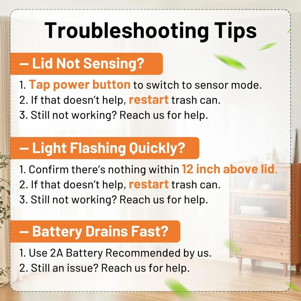 - 【WATERPROOF & MOISTURE-PROOF】 Smart Motion Sensor Garbage Bin with lid is made of high-quality PP material, making it durable and waterproof. With an IPX5 waterproof rating, it is suitable for bathroom splashes. The Garbage Can prevents water from entering, making it easier to clean.